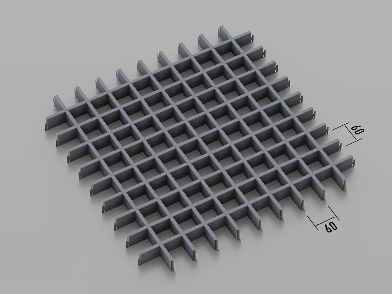 Стеля Грильято 60×60 – це сучасна підвісна система з оцинкованих і алюмінієвих профілів (по запиту), яка надає інтер'єру акуратного та легкого вигляду. Комірки 60×60 мм створюють візуально рівну поверхню, приховуючи комунікації та забезпечуючи вільну циркуляцію повітря та світла.